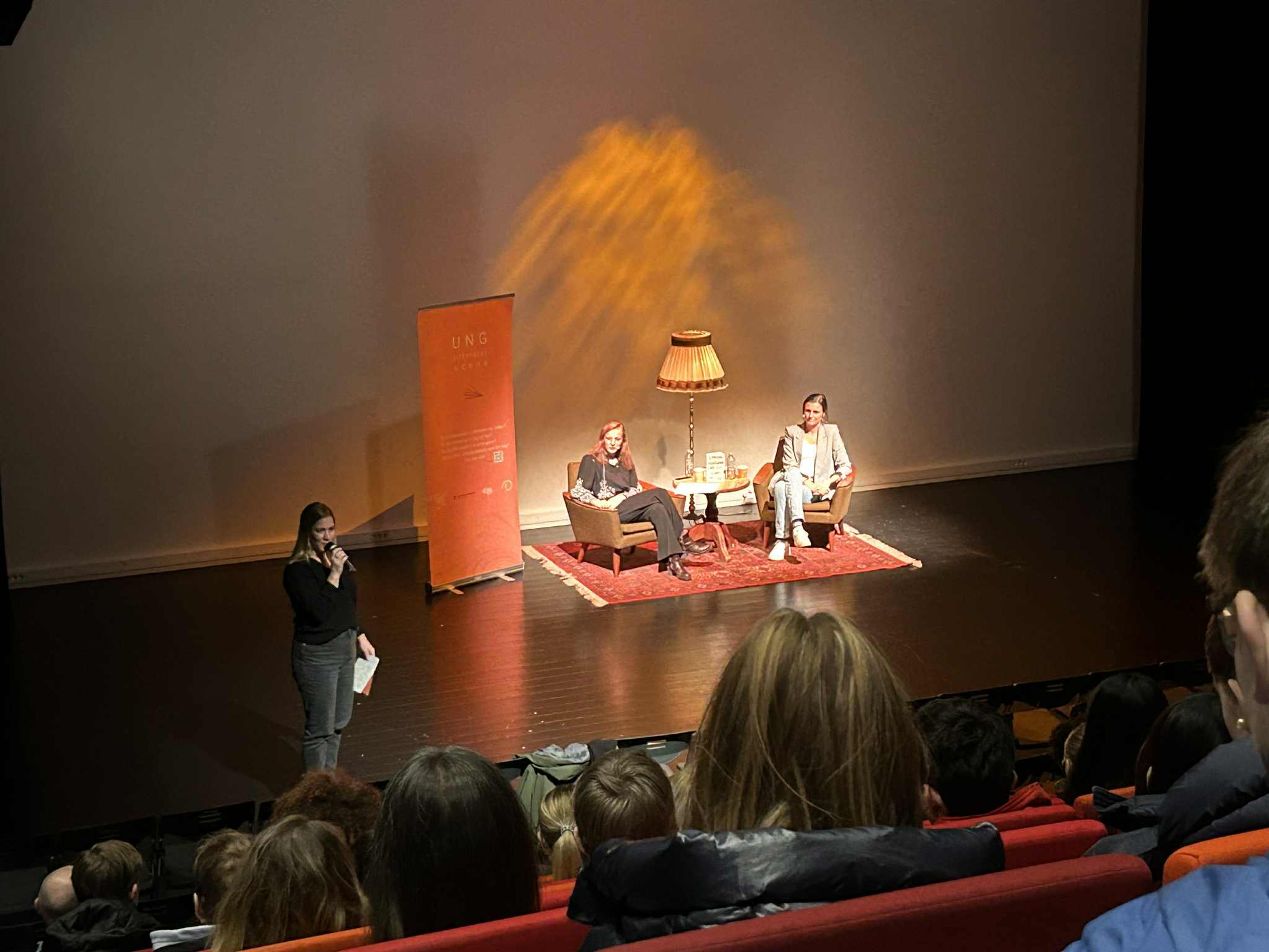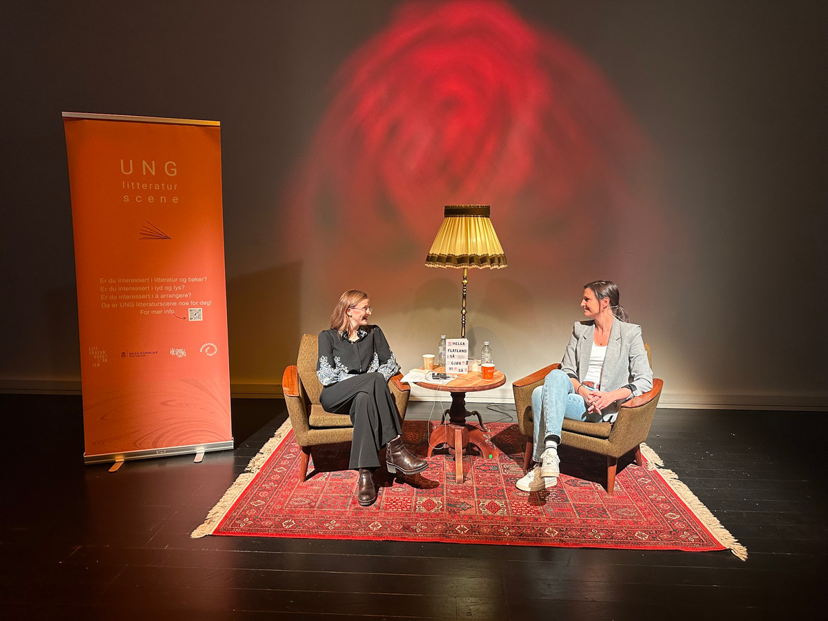 Onsdag 26/11 besøkte UNG litteraturscene Skien VGS, der Berit Marie Stokkeland (VG3) imponerte med en kjempefin samtale med favorittforfatteren sin, for mange av sine medelever. Takk til Skien VGS som tok oss varmt i mot, og som både hadde laget en flott utstilling på biblioteket og lagt til rette for en nydelig scene for anledningen. En fin måte for Litteraturhuset i Skien (LiS), Skien bibliotek & Hedvigs hybel til å vise frem vårt nye tilbud for ungdom!